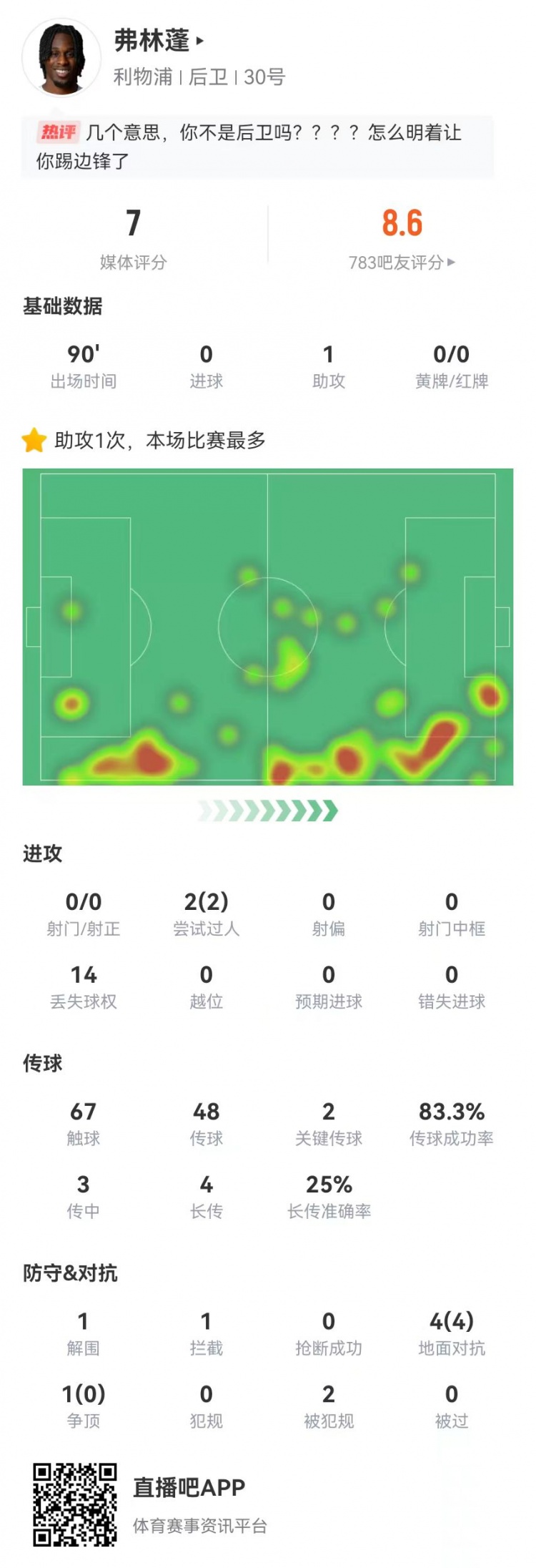 弗林蓬本场1助攻+2关键传球 2过人2成功 2造犯规+5对抗4成功